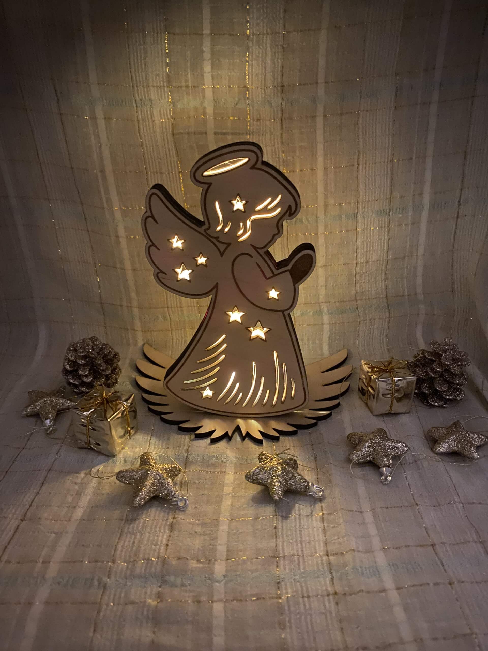 Das Design wurde in LightBurn getestet und mit 4 mm Sperrholz umgesetzt. Die vielen kleinen Sterne sowie die feinen Linien im Kleid erzeugen einen wunderschönen Lichteffekt, wenn man den Engel von innen mit einer LED beleuchtet.